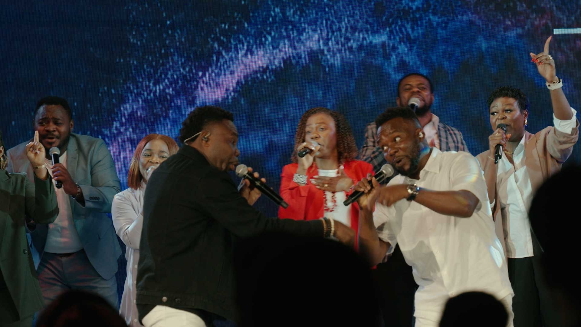 Captures both stage performance and congregation response.